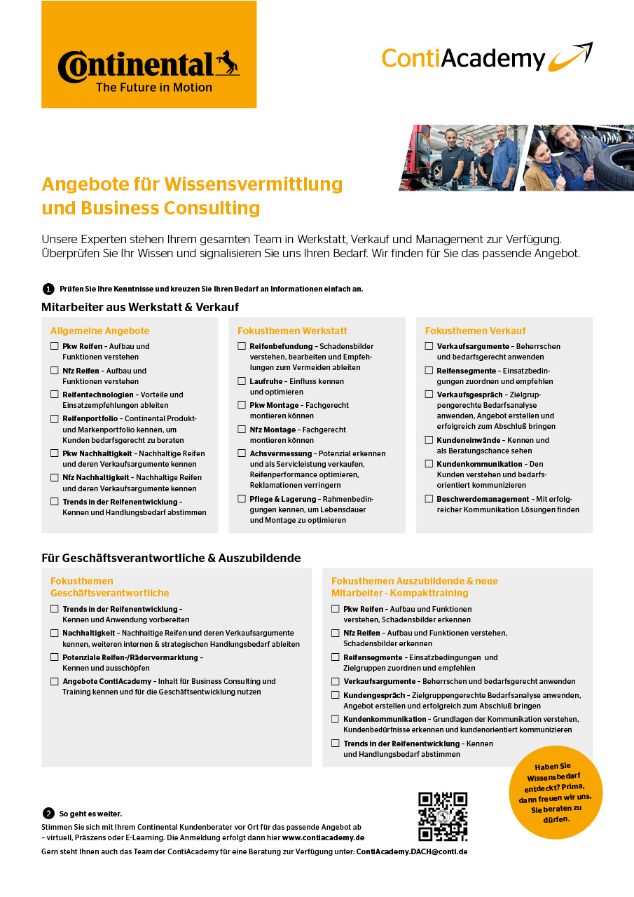 Die richtige Trainingswahl wird ganz einfach mit unserer Bedarf-Checkliste für Ihre Mitarbeiter aus Werkstatt & Verkauf, Geschäftsverantwortliche und Auszubildende. Probieren Sie es einfach aus.