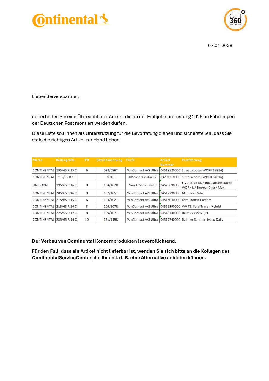 Bereifungsvorgaben & Felgengrößen Deutsche Post