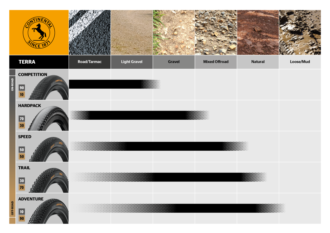 Die Terra Gravel Range ist ausgestattet mit unseren neuesten Innovationen, darunter BlackChili und Pure Grip Compound, unsere fortschrittliche Tubeless- und Hookless-Technologie, und führt Grip Compound für Trail Casings ein.