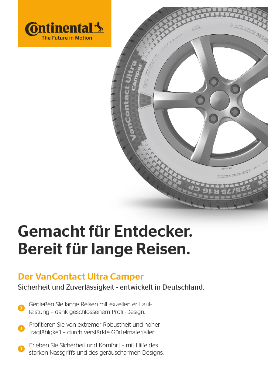 Egal wohin Ihr Camper Sie bringt – der VanContact Ultra Camper ist dafür gemacht, Sie zuverlässig ans Ziel zu bringen. Entwickelt für die besonderen Anforderungen des Reisens auf der Straße, bietet dieser Reifen die nötige Sicherheit, um jede Fahrt entspannt zu genießen. Ob auf kurvigen Bergstraßen oder langen Autobahnetappen: Das geschlossene Profil-Design sorgt für exzellente Laufleistung. Die spezielle Mischung ist auf Langstrecken ausgerichtet und hilft, Kraftstoff zu sparen – für langlebige Performance und geringen Rollwiderstand auf jeder Etappe Ihrer Reise.