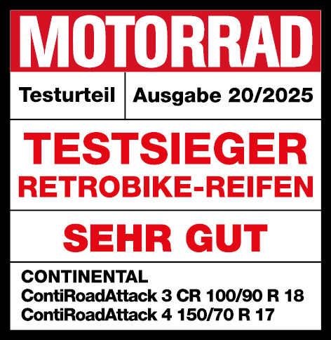 Die MOTORRAD hat im Rahmen ihres Reifentests für Retrobikes (Ausgabe 20/2025) die Kombination ContiRoadAttack 3 CR (vorn) und ContiRoadAttack 4 (hinten) in den Dimensionen 100/90 R 18 und 150/70 R 17 auf einer Triumph Bonneville T120 getestet.