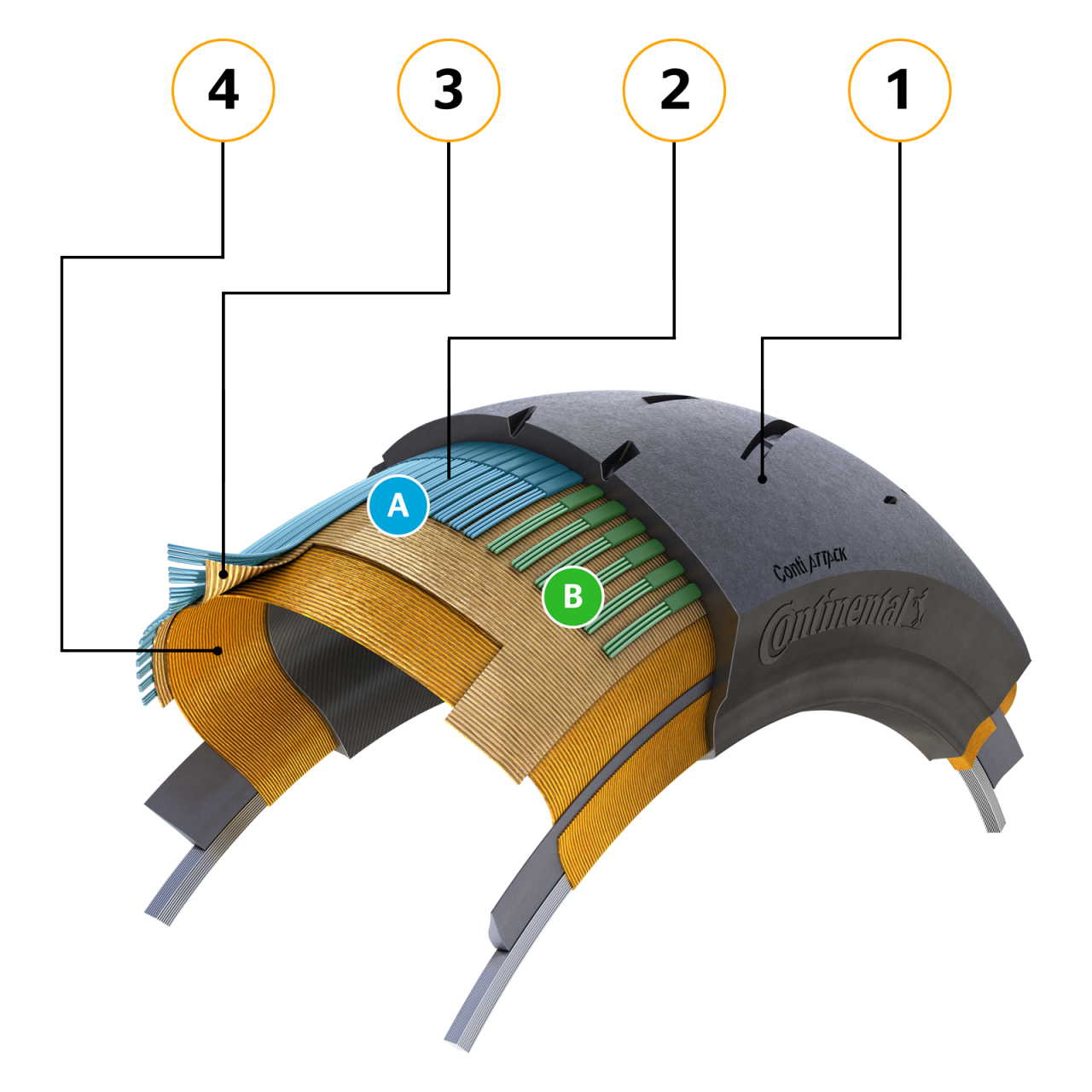 Eine weitere Spulung an der Reifenschulter führt zu einer weicheren und flexibleren Zone für eine größere Aufstandsfläche in tiefen Schräglagen. - Neue Breaker-Geometrie