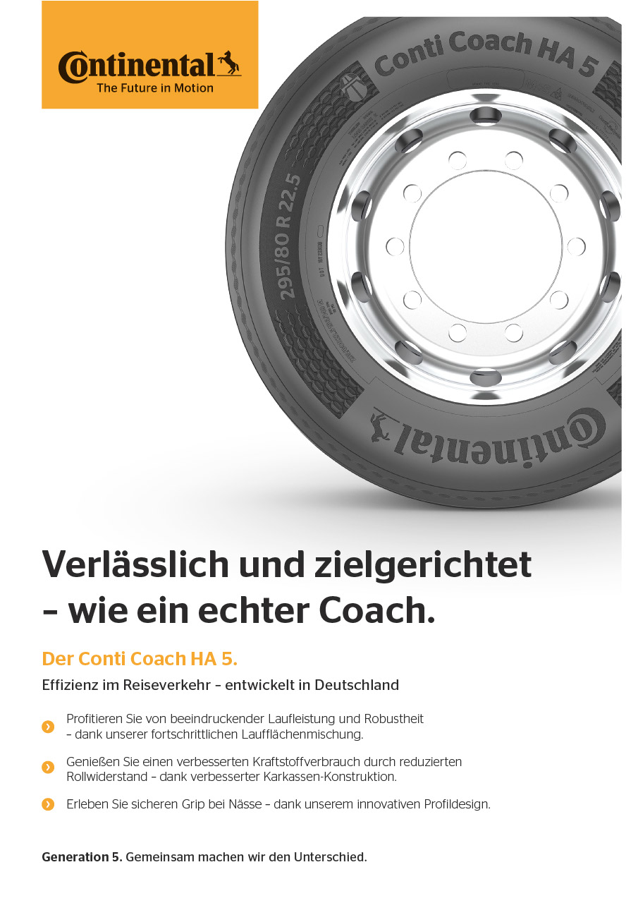 Der Conti Coach HA 5 ist darauf ausgelegt, überzeugende Leistung bis zum Ziel abzuliefern – sowohl in Sachen Laufleistung als auch Performance. Das neu entwickelte Laufflächenprofil setzt auf Robustheit über die gesamte Lebensdauer des Reifens hinweg. Dank unserer weiterentwickelten Laufflächenmischung verteilt der Reifen die Belastung gleichmäßig und liefert sogar bei schwerer Ladung und komplizierten Straßenverhältnissen Sicherheit. Dank seines neuen, intelligenten Designs kann der Conti Coach HA 5 dabei helfen, Wartungsintervalle zu verlängern und gleichzeitig die Gesamtkosten im Reifenbereich und Standzeiten zu verringern. Eine smarte Wahl für Flotten, die langfristigen Komfort und verlässliche Performance genießen wollen.